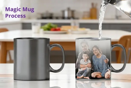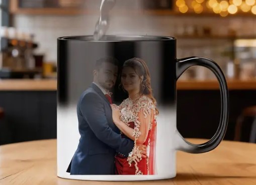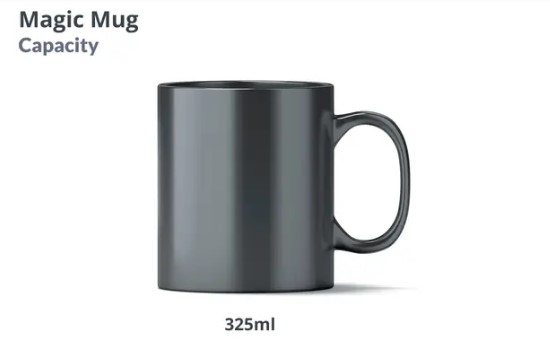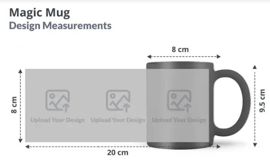 There is a maximum capacity of 325 ML for the mug. The mug measures 8 x 9.5 cm. Photos, artwork, or logos can be printed between 20 x 8 cm. Become a part of your loved one’s magical smile by gifting them a magic mug.